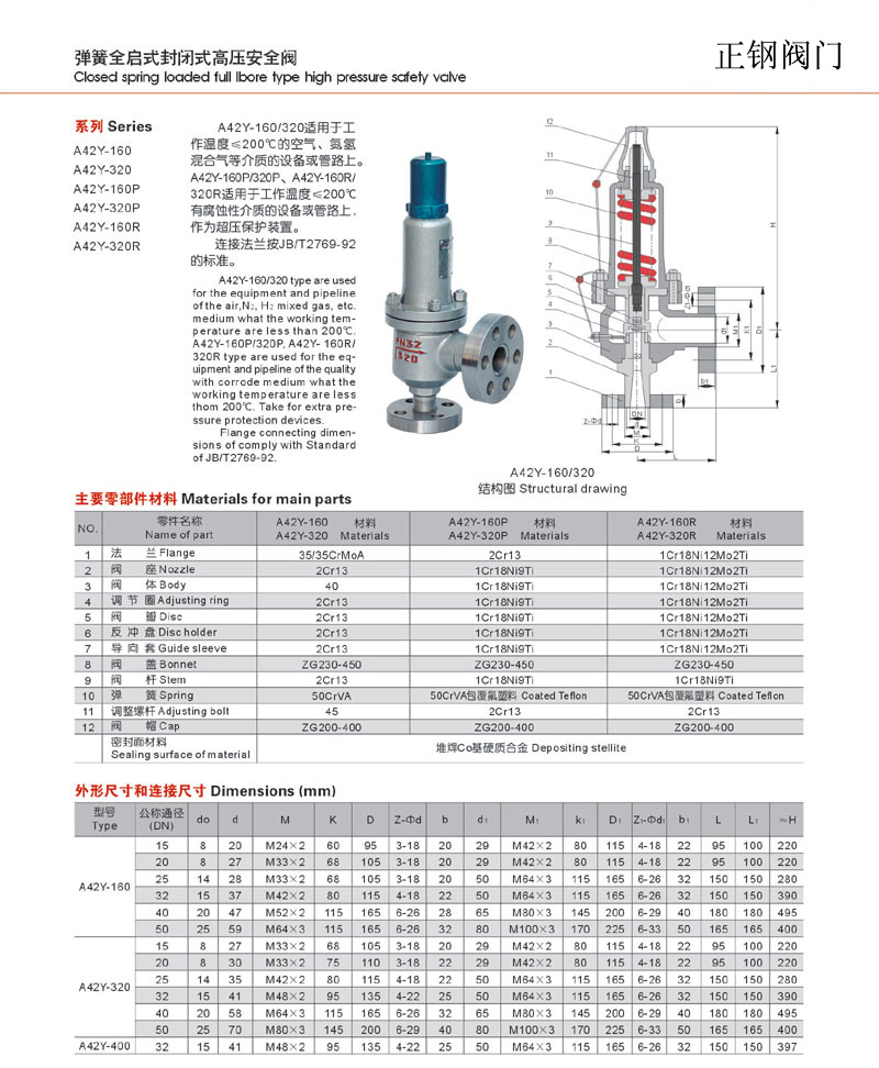 【全啟式封閉高壓安全閥零部件材料及連接尺寸】