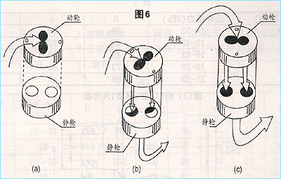 工作原理請參看下圖,介質流體從閥門的進口端進入閥腔內,假設閥門正處在“關閉”狀態(tài),見圖(a)所示,兩磨輪上的節(jié)流孔處于垂直相向位置,流道被完全堵死;隨后當手柄開始轉動一定的銳角角度,并通過閥桿的連接傳遞,使動磨輪也隨之轉動了一個銳角,這時兩個磨輪的相對位置就形成了見圖(b)所示,工作面上的流道為兩個月牙孔,流體通過兩個月牙孔被分成兩股支流,以后再合并為一股流從閥門的出口處流出。調節(jié)流量的大小也就是使手柄在90°角度之間任意轉動,以改變由兩塊動、靜磨輪組成的流道流通面積的大小來實現(xiàn)的,其工作面上流道變化的全過程就似天體月亮的圓缺變化的模樣,當手柄繼續(xù)轉至“全開”位置時,流道被完全打開,工作面上的流道截面好像兩顆滿月的月亮,見圖(c)所示。另釋,閥門在工作中,流體對磨輪產生了一定的壓力,使得動靜磨輪始終緊貼一起,更加強了工作面的密封效果,就在逆流工況時,也具有良好的密封性能。