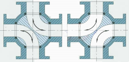 如圖所示“LL”型四通球閥只需操作扳手或執(zhí)行器將球體轉(zhuǎn)動90度,可同時對兩種介質(zhì)的流向進行切換,既方便又迅速,實現(xiàn)一閥多用的效果。